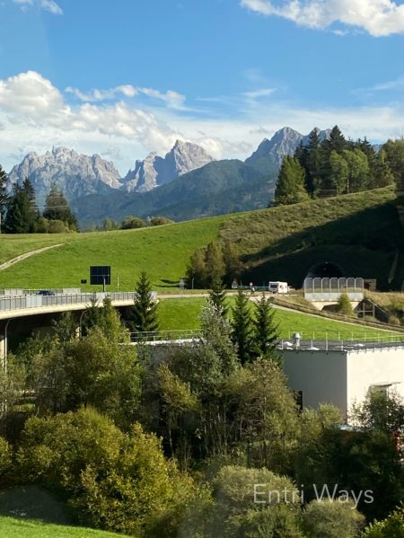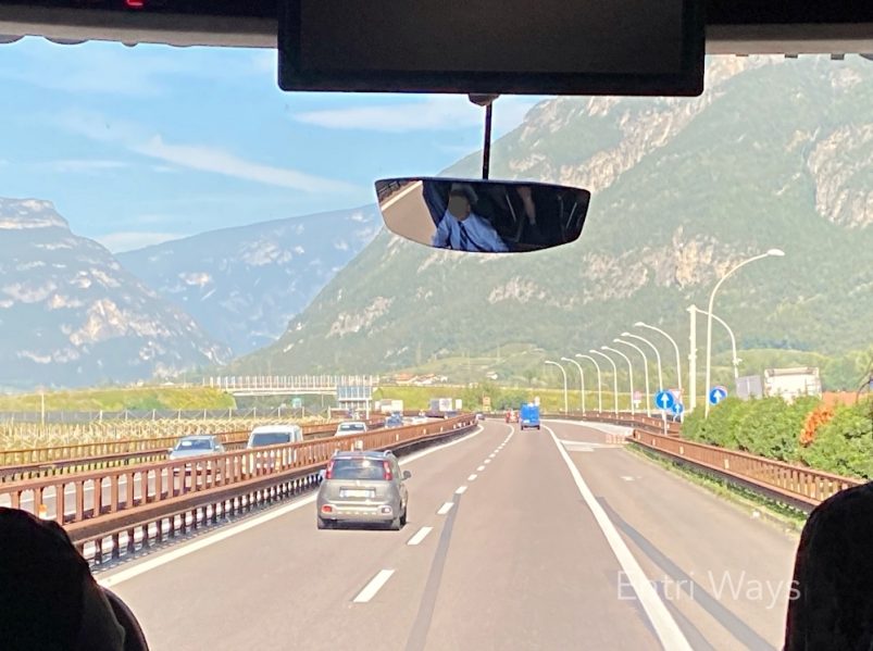 We left Verona and began the drive north to Trento. The mountains were not far off and the drive was incredibly scenic. Here’s a photo out the front window of our coach bus. And this is just the start. The mountains got much bigger as we drove closer to the Dolomites.