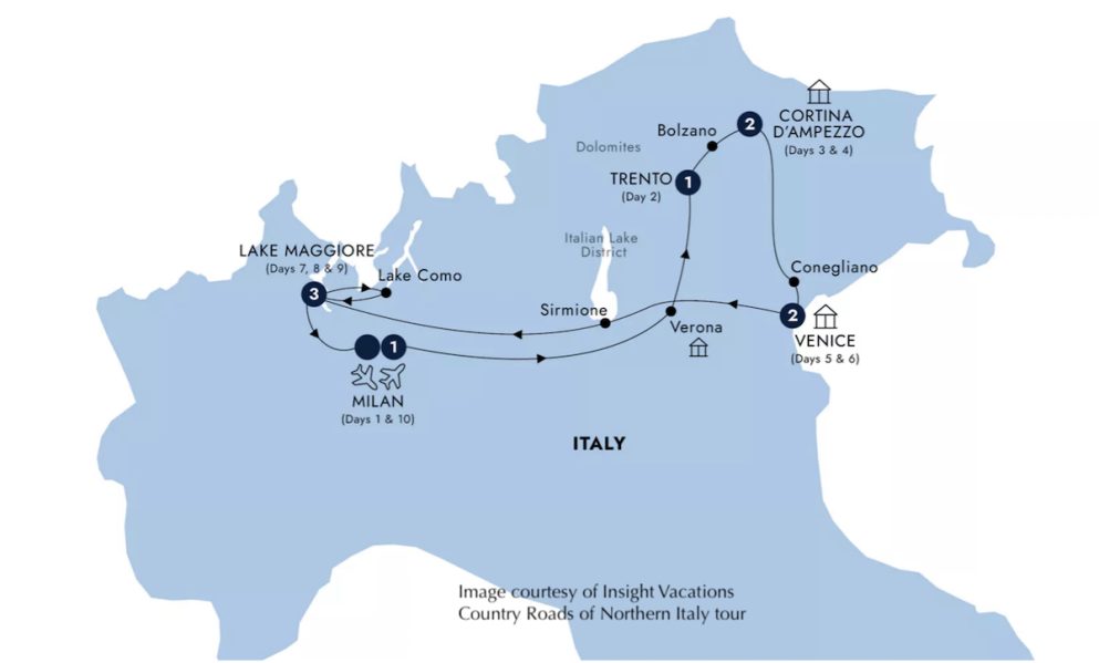 To recap, here’s a map of the full tour and bus trip that started and ended in Milan,Italy. Insight Vacations titled it the Country Roads of Northern Italy.